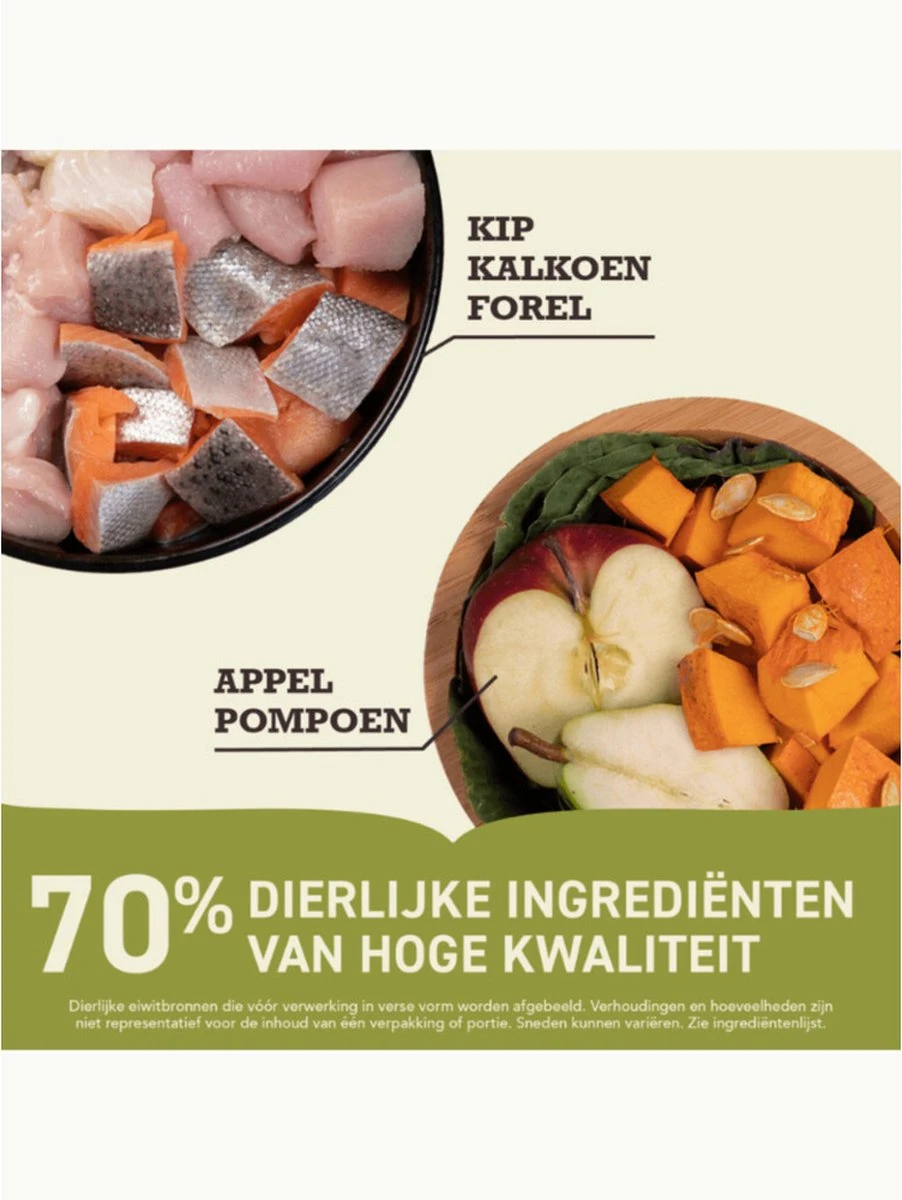 Acana Regionals Wild Prairie Dog 11,4 kg Alle honden zijn geëvolueerd als carnivoren, en gedijen van nature het beste op een voeding rijk aan vers vlees en verse vis aangevuld met kleine hoeveelheden fruit, groenten en grassen. Daarom is ACANA REGIONALS – WILD PRAIRIE rijk aan vlees van scharrelkippen, scharrel- eieren van locale boerderijen en wild gevangen snoekbaars uit Canada’s noordelijke koude meren- alles dagelijks VERS GELEVERD en daardoor rijk aan voedingswaarde en smaak. Bereid van Canada’s beste en meest verse ingrediënten in onze bekroonde keukens. ACANA REGIONALS – WILD PRAIRIE is een smakelijke manier om uw geliefde hond blij, gezond en sterk te houden. Overtuig u van onze ingrediënten en u zult het met ons eens zijn! ACANA REGIONALS: RIJK AAN VERS VLEES EN VERSE VIS (60 – 65%) AANGEVULD MET KLEINE HOEVEELHEDEN GROENTEN FRUIT EN KRUIDEN (35 – 40%) GEEN GRANEN *Vers kippenvlees (19%), gedroogd kippenvlees (18%), groene erwten, gedroogd kalkoenvlees (5%), Kippenlever olie (5%), veldbonen, rode linzen, verse aardappel, *vers kalkoenvlees (3%), *verse hele eieren (3%), *verse snoekbaars (3%), zon gedroogde luzerne, erwten vezel, *verse kippen lever (2%), haring olie (2%), verse appels, verse peren, verse zoete aardappel, verse pompoen, verse muskaatpompoen, verse pastinaak, verse wortelen, verse spinazie, veenbessen, bosbessen, zeewier, cichorei wortel, jeneverbessen, engelwortel, goudsbloem, venkel , pepermunt blad, lavendel, rozemarijn.(*) Ingrediënten VERS aan de bereiding toegevoegd! TOEVOEGINGSMIDDELEN (per kg): Nutritionele toevoegingen: Vitamine A: 15000 IU, Vitamine D3: 2000 IU, Vitamine E (CAS # 7695-91-2) : 400 IU, E1 (IJzer): 40 mg, E2 (Jodium): 3 mg, E4 (Koper): 13 mg, E5 (Magnesium): 14 mg, E6 (Zink): 150 mg, E8 (Selenium): 0.5 mg – Zoötechnische toevoegingen:Lactobacillus acidophilus LAFTI L10: 450 M CFU/kg and Enterococcus faecium NCIMB10415: 300 Mln. CFU/kg. Ruw Eiwit 31% Ruw Vet 17% Vocht