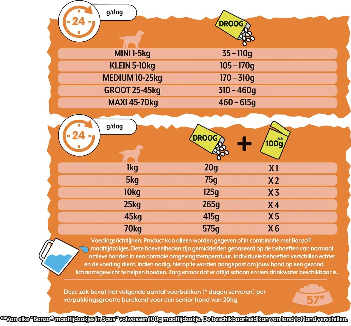 Bonzo® Senior voor honden ouder dan 7 jaar biedt een 100% volledige en gebalanceerde maaltijd, speciaal ontwikkeld om de gewrichten van jouw hond gezond te helpen houden en zijn mobiliteit te ondersteunen.
