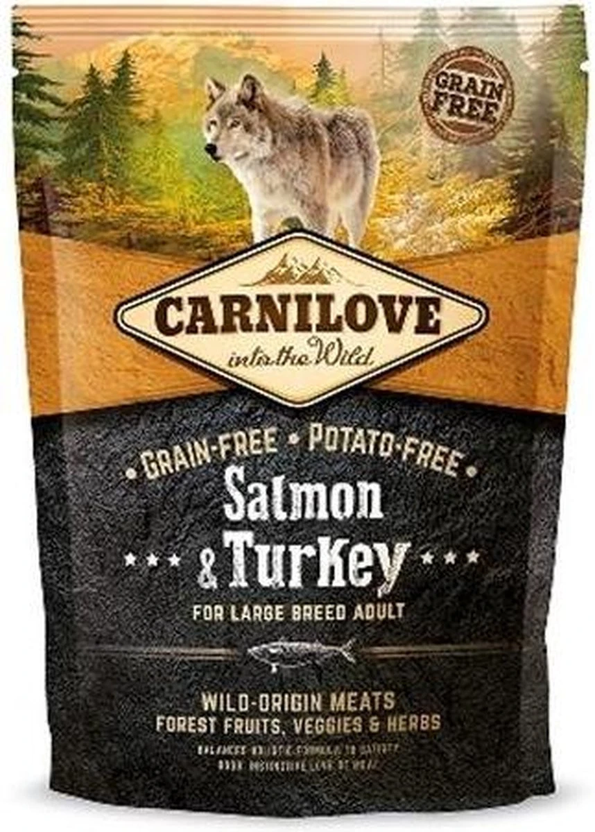 Carnilove Salmon/Turkey Adult Large Breed Carnilove Salmon/Turkey Adult Large Breed is graanvrij, kwalitatief hoogwaardig hondenvoer voor honden met zalm en kalkoen, aansluitend bij de natuurlijke voedingsbehoefte van grote hondenrassen. Deze brokken zijn geheel vrij van aardappel en graan, omdat deze ook niet in het natuurlijke dieet van de wilde hond en wolf voorkomen. In plaats daarvan is er gebruik gemaakt van ingrediënten die beter aansluiten bij de voedingsbehoefte van de hond, namelijk een hoog aandeel dierlijke ingrediënten gecombineerd met verse groenten, fruit, kruiden en mineralen. Deze bevatten belangrijke vitaminen en anti-oxidanten, die door de structuur van de gebruikte eiwitten optimaal opgenomen worden door de hond. Speciaal samengesteld van honden van grotere rassen in verband met hun andere voedingsbehoeften, met een gewicht meer dan 25 kg. Nauwkeurig uitgebalanceerd, makkelijker verteerbaar, holistisch en ook gewoon heel erg lekker! – Holistische hondenvoeding voor volwassen honden – Hoog in vleesgehalte – Met groenten, fruit en kruiden die belangrijk anti-oxidanten en vitaminen bevatten – Gemakkelijk verteerbaar en aansluitend bij de natuurlijke voedingsbehoefte van de hond Samenstelling: zalmmeel (25%), kalkoenmeel (20%), gele erwten (20%), kippenvet (met tocoferolen als conserveringsmiddelen, 10%), eendenmeel (5%), zalm graatvrij (5%), kippenlever (3%), appels (3%), tapiocazetmeel (3%), zalmolie (2%), wortels (1%), lijnzaad (1%), kikkererwten (1%), gehydrolyseerde schalen van schaaldieren (een bron van glucosamine, 0,05%), kraakbeenextract (een bron van chondroïtine, 0,03%), biergist (een bron van mannan-oligosachariden, 0,015%), cichoreiwortel (een bron van fructo-oligosachariden, 0,01%), Yucca schidigera (0,01%), algen (0,01%), psyllium (0,01%), tijm (0,01%), rozemarijn (0,01%), oregano (0,01%), veenbessen (0,0008%), bosbessen (0,0008%), frambozen (0,0008%). Analytische bestanddelen: ruw eiwit 36,0%, vetgehalte 16,0%, ruwe as 7,8%, ruwe celstof 3,0%, vochtgehalte 10,0%, calcium 1,3%, fosfor 1,0%. Nutritionele toevoegingsmiddelen per 1 kg: vitamine A (E672) 20.000 IE, vitamine D3 (E671) 1500 IE, vitamine E (α-tocoferol) (3a700) 400 mg, zink (E6) 85 mg, ijzer (E1) 70 mg, mangaan (E5) 35 mg, jodium (E2) 0,65 mg, koper (E4) 15 mg, selenium (3b8.10) 0,25 mg.