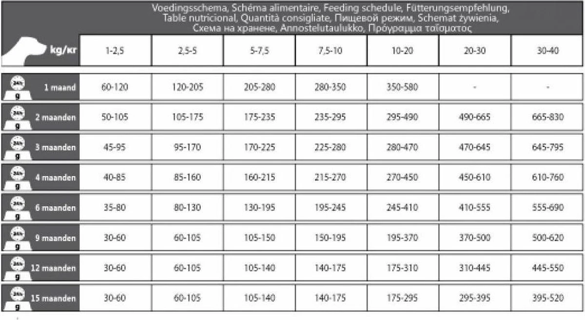Bovenstaande adviezen zijn gemiddelden, het is mogelijk dat uw hond iets meer of juist iets minder voedselbehoefte heeft, houdt daarom de conditie van uw hond goed in de gaten. Zorg ervoor dat uw hond in ieder geval niet te zwaar wordt, dat is slecht voor zijn gezondheid en conditie, bovendien loopt u de kans dat uw hond het voedsel gaat weigeren. Zorg steeds voor voldoende vers drinkwater. Bewaar het voer altijd koel en droog.