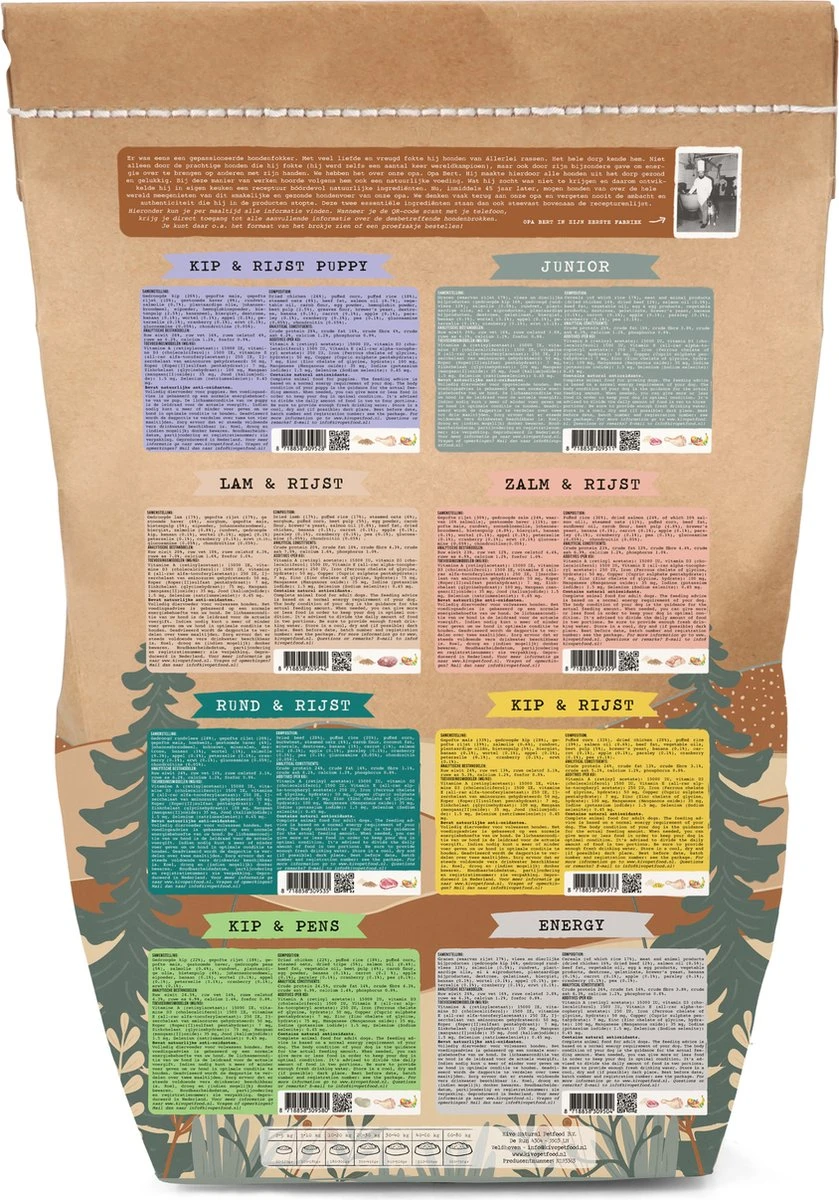 Samenstelling: Gedroogde kip (28%), gepofte mais, gestoomde rijst (17%), gestoomde sorghum, bietenpulp, plantaardig vet, lignosulfonaat, biergist, dierlijk vet, zalmolie (0.6%), zonnebloemolie, erwt (0.1%), wortel (0.1%), banaan (0.1%), peterselie (0.1%), brandnetel (0.1%), appel (0.1%), cranberry (0.1%)