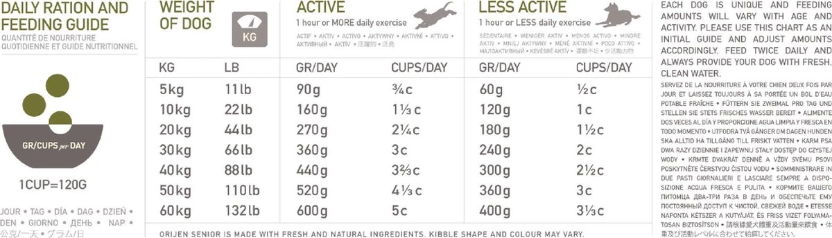 Orijen Senior Dog 2 Kg We bereiden ORIJEN SENIOR met natuurlijke dierlijke eiwitten van scharrelkip en kalkoen, in het wild gevangen vis en scharreleieren, dagelijks VERS van regionale boerderijen en oceanen. Beperkt in koolhydraten en glycemische waarde bevorderd ORIJEN de gezondheid van alle oudere honden inclusief die van jou.