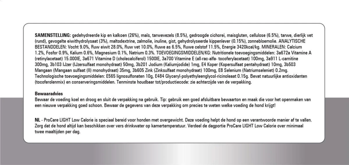 LET OP: ProCare light dient niet langer dan 6 maanden gevoerd te worden. Deze voeding is niet geschikt voor drachtige teven.