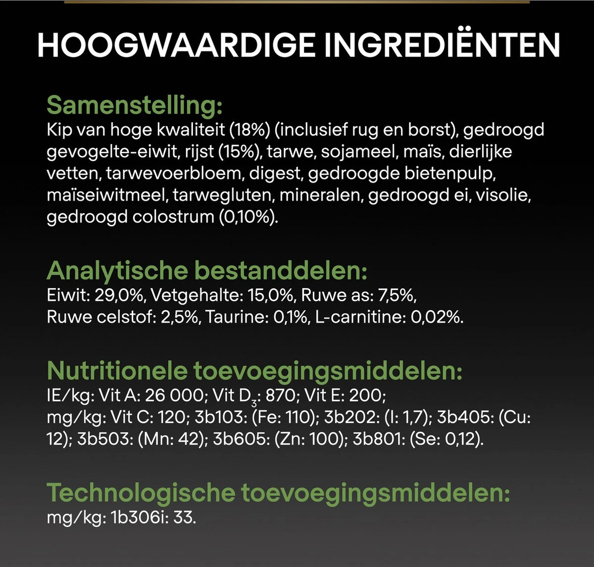 PURINA® PRO PLAN® Healthy Start hondenvoer rijk aan kip heeft een aangepaste combinatie van eiwit- en vetgehaltes ter ondersteuning van een gezonde groei en gezondheid van jouw puppy op lange termijn. Healthy start bevat belangrijke bijvoorbeeld voedingsstoffen die helpen bij het ondersteunen van gezonde gewrichten voor de actieve levensstijl van jouw puppy, zoals colostrum, wat de immuunreactie van puppy’s tot 50% meer helpt versterken. Het nummer 1 ingrediënt is altijd stukken kip, lam, zalm, kalkoen of rundvlees van hoge kwaliteit, ingevroren om belangrijke voedingsstoffen vast te houden en perfect gekookt voor een heerlijke smaak. Bij PURINA PRO PLAN past ons team van voedingsdeskundigen en deskundige dierenartsen geavanceerde wetenschap toe om onze meest geavanceerde en efficiënte combinatie van voedingsstoffen voor jouw huisdier te ontwikkelen.