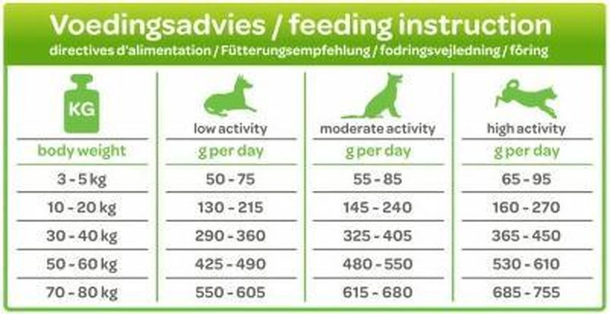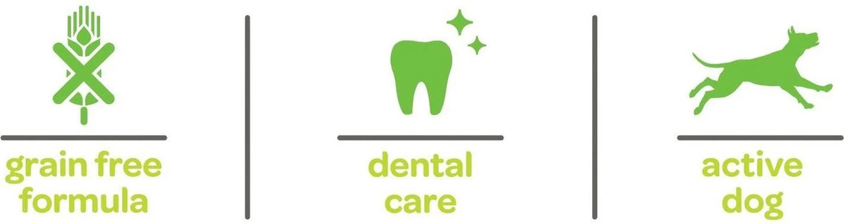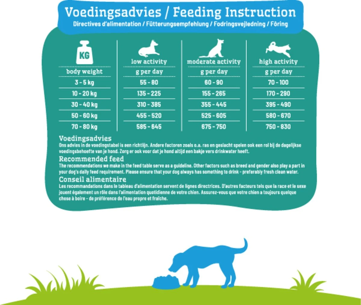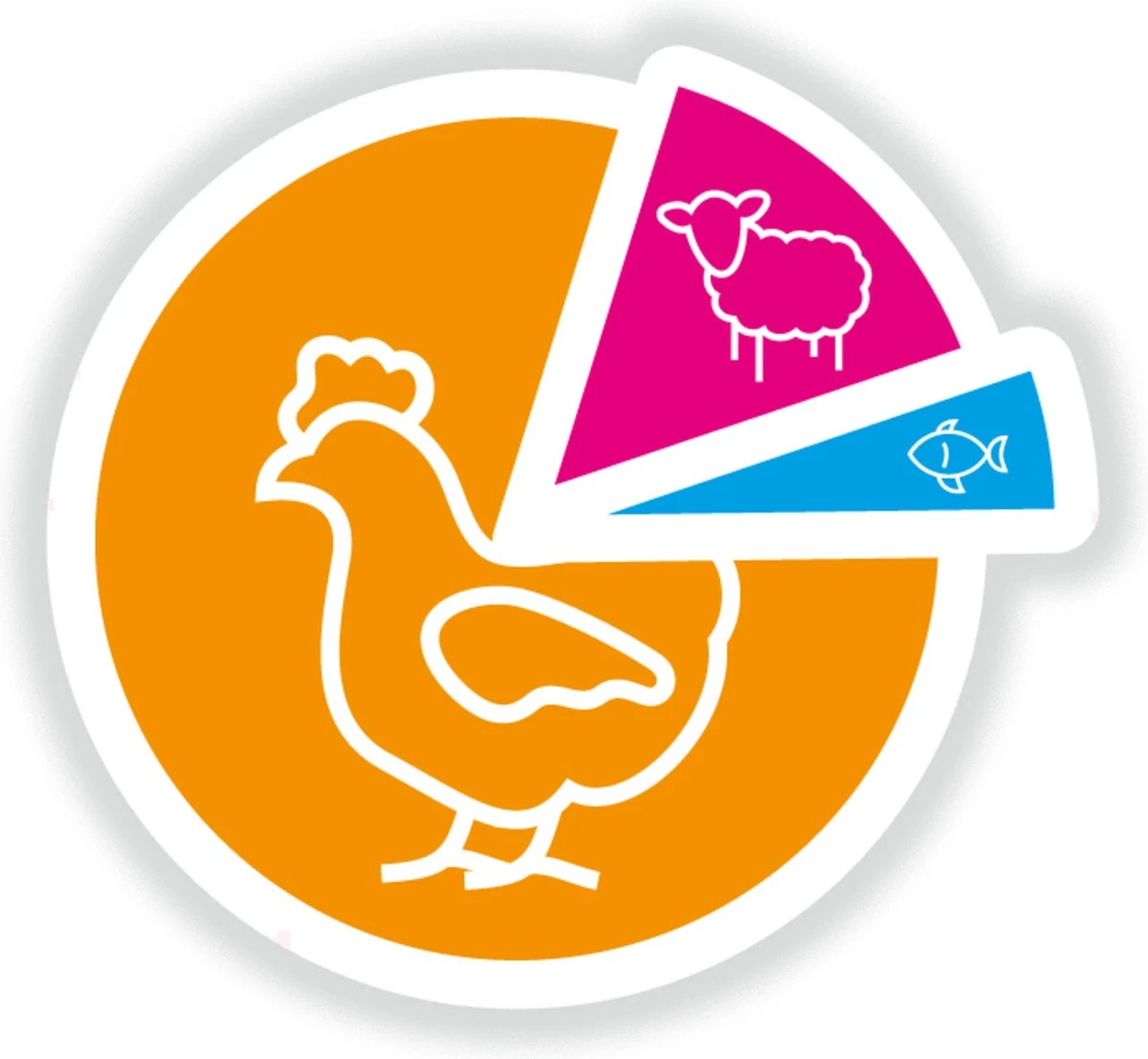 Gevogeltevleesmeel (29% kip), groene erwten, aardappel, bietenpulp, gevogeltevet, lamsvleesmeel, MSC vismeel (2%)*, heel eipoeder (zonder schaal) , gist, geraffineerde lijnzaadolie, vitaminen, cichorei, soja, mineralen, gehydroliseerde kippenlever, aroniabes concentraat (0,1%), natriumpolyfosfaat (0,1%), rozemarijn extract, groene thee extract, raapzaadolie, pepermunt extract, gehydroliseerde visproteïne.