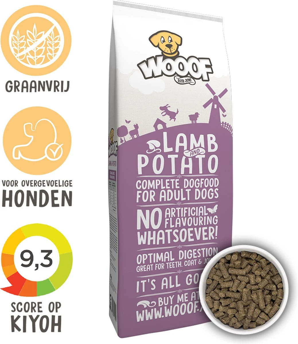 WOOOF Lam & Aardappel 18KG is een zeer compleet en natuurlijk 100% graanvrij hypoallergeen hondenvoer voor alle honden.
